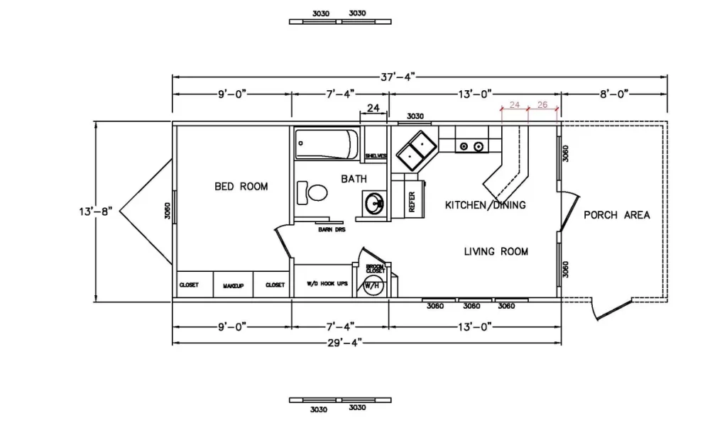 • Private Bedroom & Bath: A private 10′-8″ long Bedroom is designed for comfort and features windows on three walls. The adjacent 5′-4″ long Bathroom includes a toilet, sink, and full bathtub.