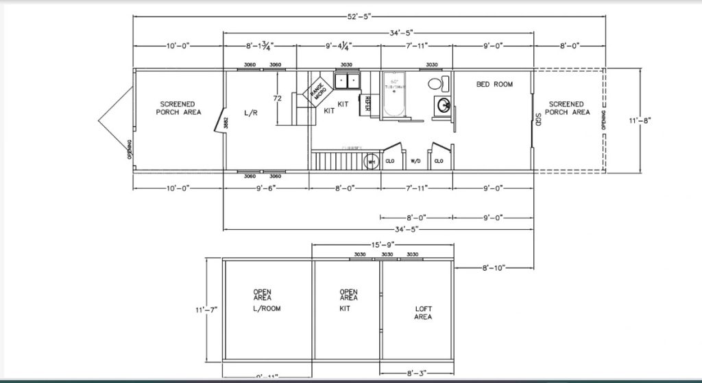 The River Stone 4B 115 stands out in our lineup for its balanced design, generous loft area, and two screened porches—one at each end of the home. With a total length of 52′-5″ and a width of 11′-8″, this model creates versatile living opportunities for families, couples, and short-term rental owners who want strong curb appeal and flexible sleeping or storage space. The full-length loft dramatically increases usable square footage, while the dual porches turn this model into a true indoor–outdoor retreat fit for mountain, lakeside, or wooded properties.
