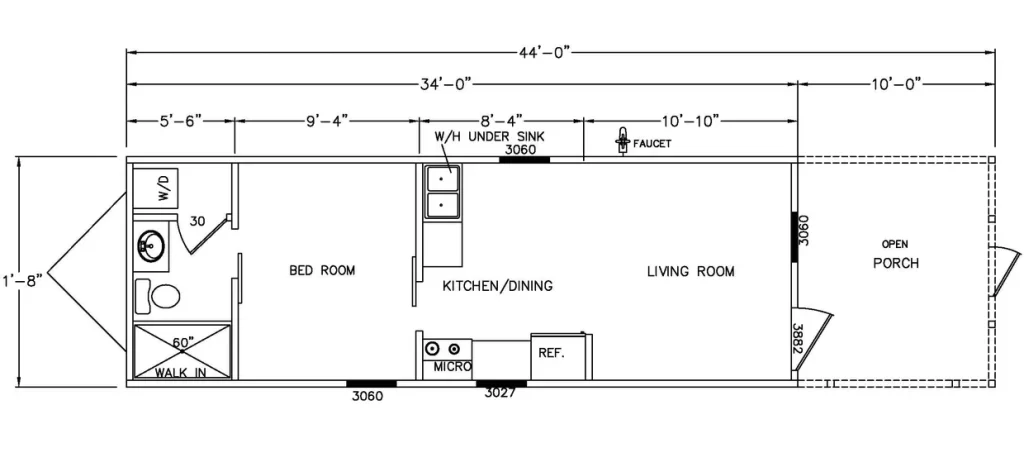 The Rustic Ridge 4B 108 is designed for buyers who want simplicity, comfort, and efficient single-level living in a beautifully balanced open layout. With an overall main-unit length of 34’-0” and a full length of 44’-0” including the porch, plus a width of 11′-8″, this model offers easy movement, a large living room, an open kitchen/dining zone, a private bedroom suite, and an inviting 10’-0” deep open porch. It’s an excellent fit for full-time living, weekend retreats, or scenic placements on mountain and lakeside properties.