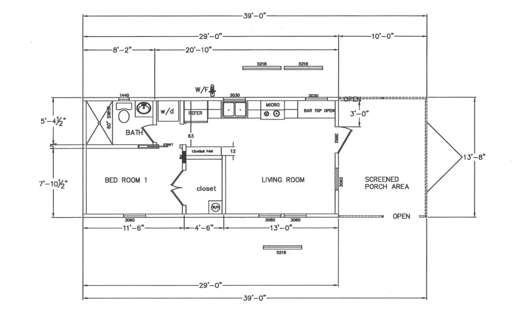 Trailhead 4B 126 offers a clean, straightforward layout perfect for buyers who want comfort without complexity. With a main unit length of 39′-0″ (plus a 13′-8″ screened porch) and a width of 11′-8″, this model includes a roomy living area, a full kitchen with a bar-top counter, a private bedroom, and a well-appointed bathroom. It’s ideal for couples, solo residents, cabin rentals, or seasonal placements where space, flow, and low maintenance matter most.